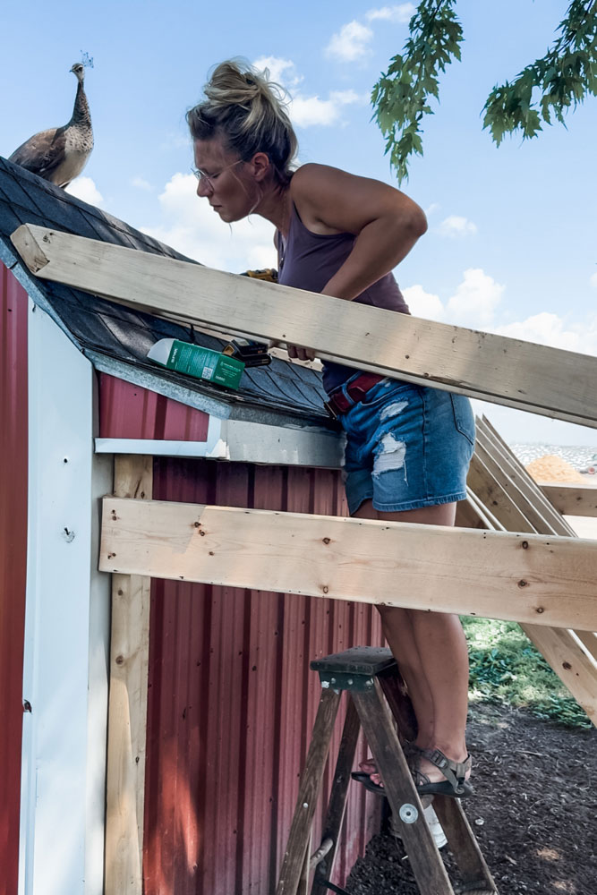 Whether it’s Pete climbing on the roof to inspect our yard, or the chickens below who are thankful to wait out the rain under a secure structure, our shingled roof was a needed step.